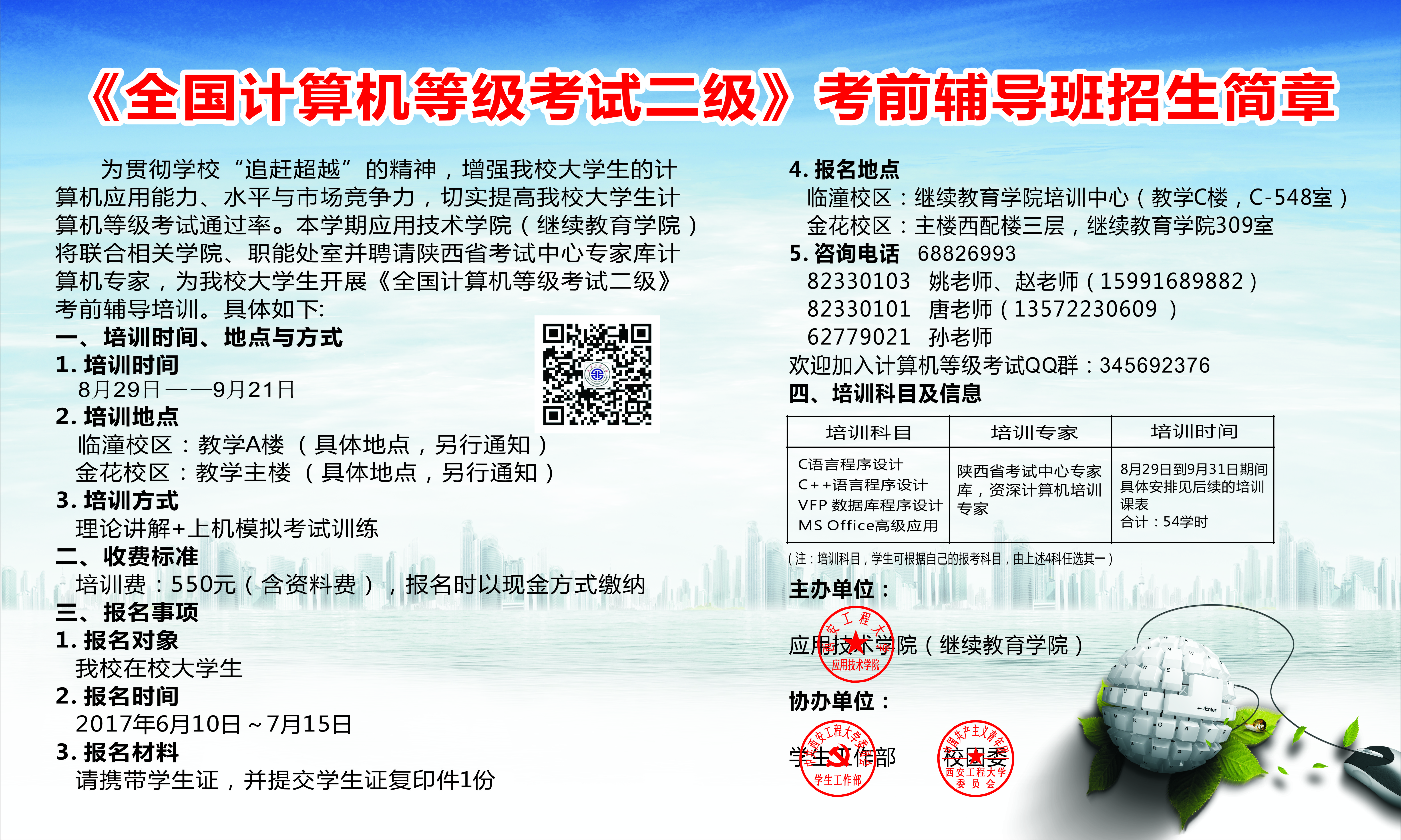 为贯彻学校“追赶超越”的精神,增强必赢官网大学生的计算机应用能力、水平与市场竞争力,切实提高必赢官网大学生计算机等级考试通过率。本学期必赢线路检测3003(继续教育学院)将联合相关学院、职能处室并聘请陕西省考试中心专家库计算机专家,为必赢官网大学生开展《全国计算机等级考试二级》考前辅导培训。具体如下